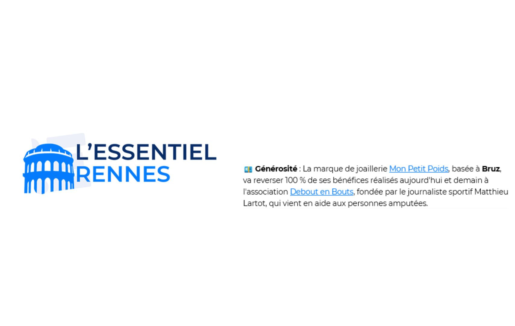 "La marque de joaillerie Mon Petit Poids basée à Bruz, va reverser 100 % de ses bénéfices réalisés aujourd'hui et demain à l'association Debout en Bouts fondée par le journaliste sportif Mathieu Lartot, qui vient en aide aux personnes amputées."